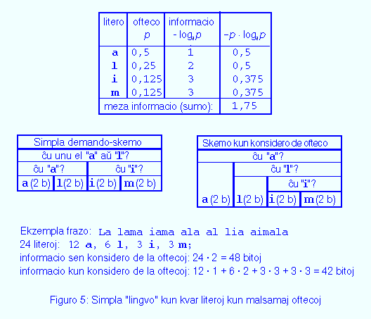 Figuro 5 montras simplan "lingvon" kun kvar literoj, kiuj do povus porti log2 4 = 2 bitojn. La plej simpla demando-skemo, cxiam duoniganta la signaron, do bezonas 2 decidojn; sed konsiderante la malsamajn oftecojn de la signoj, oni vidas ke la meza informacio de litero estas nur 1,75 bitoj. La sama fenomeno okazas en homaj lingvoj: Bauer kaj Goos [1] indikas por la germana lingvo kun 26 literoj (+ vorto-limo) mezan informacion de 4,11 bitoj, anstataux log2 27 = 4,75. Sherwood donas en [14, 15] la relativajn oftecojn de la fonemoj en konversacio en Esperanto; laux lia tabelo de du-fonemoj konkludeblas, ke la vorto-limo havis oftecon de cx. 15,2 %, simile kiel en la germana. El tio sekvas meza informacio de 4,10 bitoj / signo, anstataux log2 29 = 4,86 sen konsidero de la oftecoj.