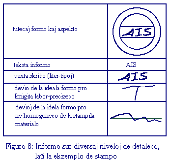 Figuro 8 montras diversajn nivelojn de detaleco laux la ekzemplo de stampo. La produktanto de la auxtentika stampilo devas okupigxi nur pri la unuaj tri niveloj; sed se falsanto imitas nur tiujn, komparo kun auxtentika stampo rivelos diferencojn sur la kvara aux almenaux la kvina nivelo.