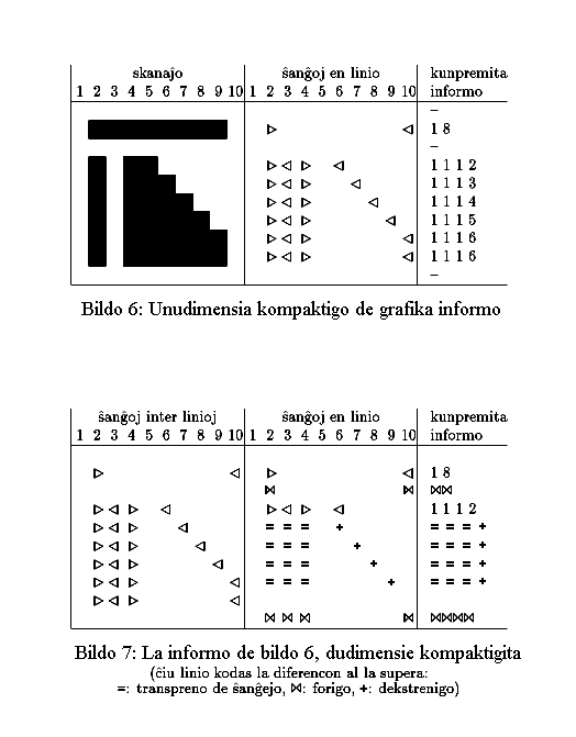 Figuro 5 montras simplan "lingvon" kun kvar literoj, kiuj do povus porti log2 4 = 2 bitojn. La plej simpla demando-skemo, cxiam duoniganta la signaron, do bezonas 2 decidojn; sed konsiderante la malsamajn oftecojn de la signoj, oni vidas ke la meza informacio de litero estas nur 1,75 bitoj. La sama fenomeno okazas en homaj lingvoj: Bauer kaj Goos [1] indikas por la germana lingvo kun 26 literoj (+ vorto-limo) mezan informacion de 4,11 bitoj, anstataux log2 27 = 4,75. Sherwood donas en [14, 15] la relativajn oftecojn de la fonemoj en konversacio en Esperanto; laux lia tabelo de du-fonemoj konkludeblas, ke la vorto-limo havis oftecon de cx. 15,2 %, simile kiel en la germana. El tio sekvas meza informacio de 4,10 bitoj / signo, anstataux log2 29 = 4,86 sen konsidero de la oftecoj.