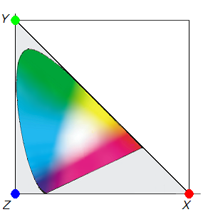 Tiu figuro estas la (proksimuma) kolor-triangulo fiksita en 1931 de la Internacia Lum-Komisiono CIE (Commission Internationale d'Eclairage). La koordinata sistemo, kiu enhavas la kolor-triangulon, orientiĝas inter du virtualaj kolor-paroj: